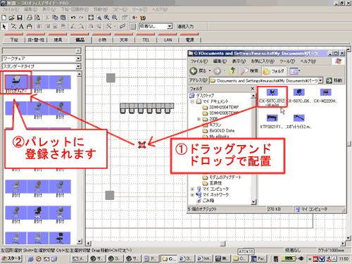 ダウンロードページからのドラッグ&ドロップと同様に、お使いのコンピュータやネットワーク内にあるパーツを、エクスプローラからドラッグ&ドロップでパレットにコピーしたり、図面上に配置したりすることができます。