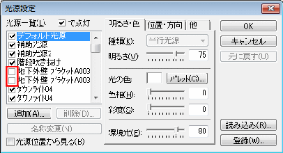 表示された[光源設定]の光源一覧からパースに影響しない光源をオフにしてください。