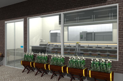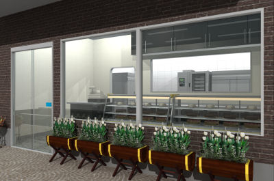 ショーケースのガラスと、厨房開口部のガラス、厨房のパーツのガラスを削除した状態でレンダリングしています。