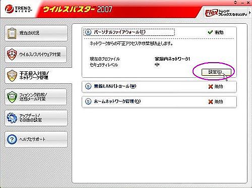 | グループFAXを初回起動する際に、ウィルスバスター2007で表示される画面で接続を許可しなかった場合は、グループFAXが使用できなくなります。 そのような場合は、ウィルスバスター2007の設定を次のように変更してください。 |