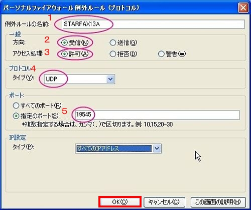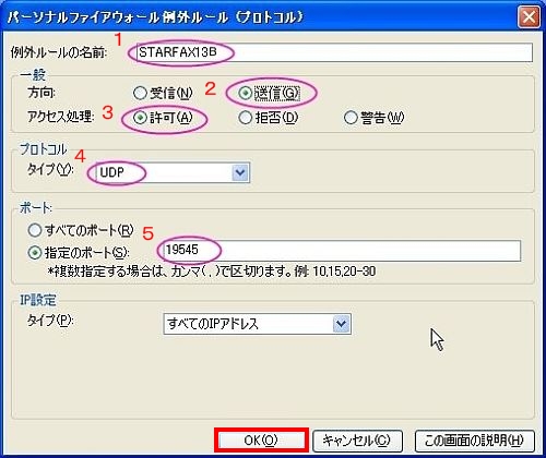 | 5. | 以下の通りに設定、入力を行い最後に[OK]をクリックします。 1.例外ルールの名前 : STARFAX13A 2.方向 : 受信 3.アクセス処理 : 許可 4.タイプ : UDP 5.指定のポート : 19545
