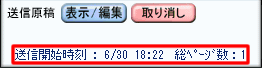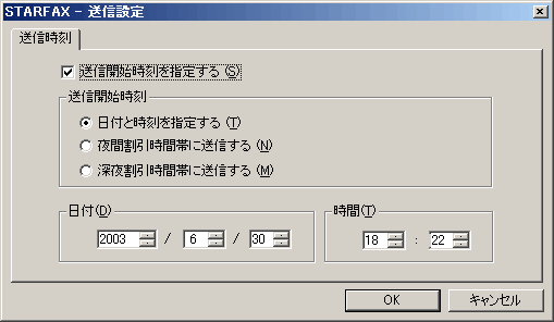 | 4. | 「日付と時刻指定する」をクリックし、送信したい日付と時刻を設定し[OK]をクリックすると、セットされた送信原稿に日時が設定されます。![]() |