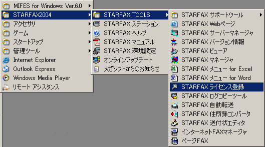 ライセンス登録の方法をご案内します。 モデム共有で複数ライセンスをご購入の場合、サーバー、クライアント共にライセンス登録を行なってください。 また、ライセンス登録の際はSTARFAX関連のプログラムをすべて終了後、ライセンス登録を行なってください。 Windowsの[スタート]ボタン-[プログラム]-[STARFAX2004]-[STARFAX TOOLS]-[STARFAX ライセンス登録]を起動します。 ![]() |