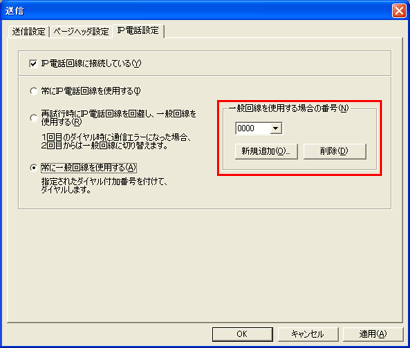 | 6. | 手順5で[再試行時にIP電話回線を回避し、一般回線を使用する]や[常に一般回線を使用する]を選んだ場合は、[一般回線を使用する場合の番号]を設定します。 |