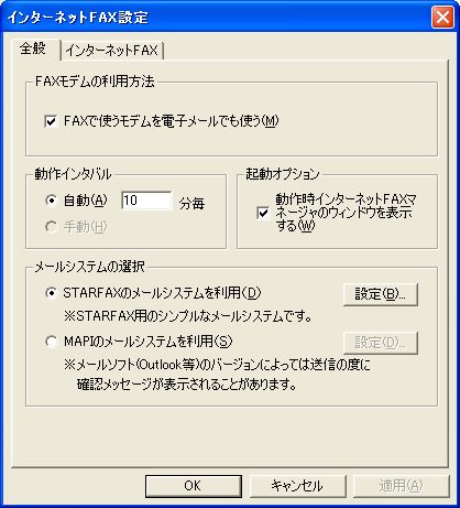 [STARFAX環境設定]→[通信経路]→[インターネットFAXを使用する]にチェック→[OK]