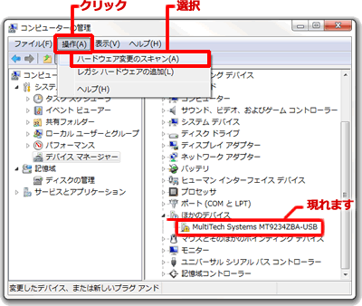 1)「操作」メニューをクリックして「ハードウェア変更のスキャン」を選択します。