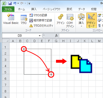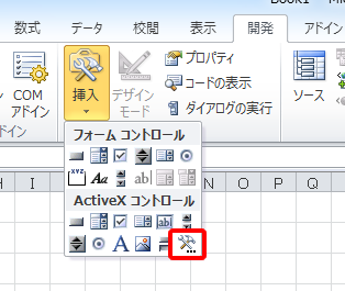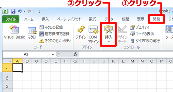 - 「開発」タブを開き、「コントロール」グループの「挿入」