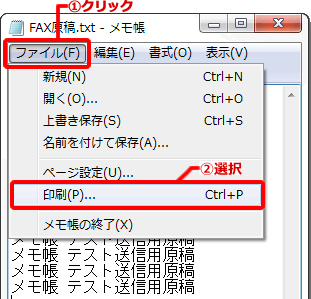 相手先に送信する、FAX原稿を「ファイル」メニューから 「印刷」を選択してセットします。
