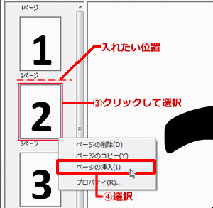 4)選択したページを右クリックして「ページの挿入」を選択します。