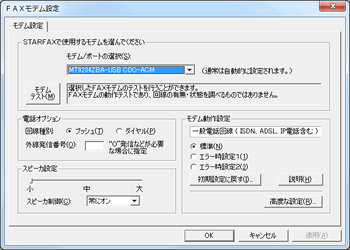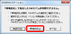 パソコンからFAXモデムを確認できなかった場合に表示されます。FAXモデムがパソコンに正しく接続されているか、確認してください。 ・「FAXモデム設定」画面が表示された STARFAX以外のアプリケーションで使用している可能性があります。STARFAX以外のアプリケーションを、終了して、もう一度起動してください。 |