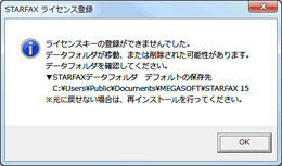 確認を行った際に、データフォルダーがなかったり、ライセンスキーが確認できなかった場合に表示されます。