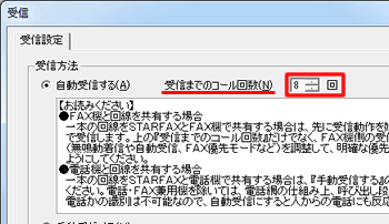 ナンバーディスプレイの契約や、番号通知サービスを利用されている場合、着信する前に番号情報の信号が流れます。 FAXモデムは、この信号が「切断信号」と誤って認識してしまうため受信直後に切断してしまうことがあります。 ※ISDNのナンバー表示機能を使用した場合でも同様の現象が起こることがあります。 FAXで使用されている電話番号のナンバーディスプレイ契約を解除していただくか、 STARFAXの受信までのコール回数を8回以上に設定することで回避できます。 コール回数を変更する場合は、以下操作方法をご参照ください。 ※BeryKoKoの「CX-FU02」は、受信エラーが頻繁に発生するため、動作保証しておりません。 ※FAXモデムに、「技術基準適合証明マーク(俗に『テレックマーク』や『技適マーク』)」が 貼付されていないFAXモデムでは、動作保証しておりません。 ■対象製品 ■操作方法