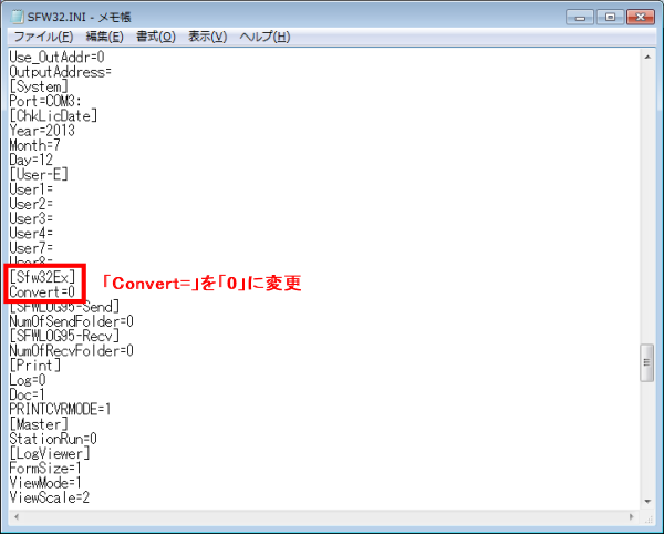 開いた[メモ帳]で、[Sfw32Ex]の項目の「Convert=」を「1」から「0」に変更して上書き保存します。