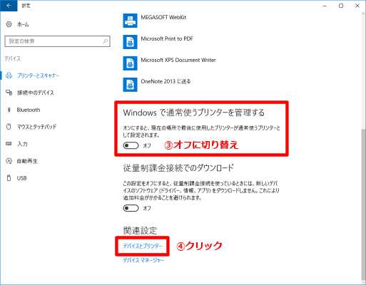 「Windows 10」のアップデート後、 「Windowsで通常使うプリンターを管理する」 という機能が追加され、初期設定で「オン」に設定されています。 この機能は、直前に使用したプリンターを既定のプリンターに自動的に切り替えるという機能です。 そのため、STARFAXを使用する前に通常のプリンターで印刷をしていた場合、Windows側で既定に設定されたプリンターが有効となり、[STARFAXステーション]にファイルをドラッグ&ドロップすると、通常のプリンターで印刷されてしまいます。 以下の操作方法で、機能をオフにしてください。 機能をオフにすることで、Windows 8.1以下と同様、通常使用するプリンターが固定されます。 ■対象製品 ■操作方法