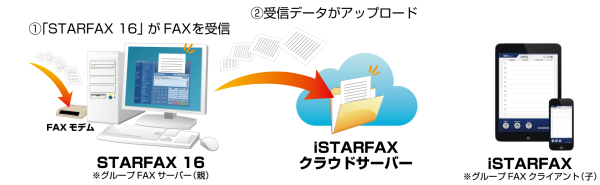 「STARFAX 16」でFAXを受信すると、「iSTARFAXクラウドサーバー」に受信データがアップロードされます。