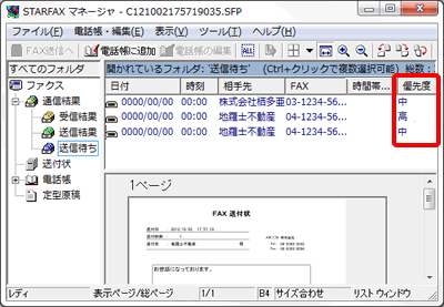 「割り込み送信」を指定したFAXは、「優先度」が「高」と表示されます。