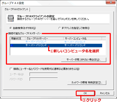 「接続可能なグループFAXサーバー」一覧から、 新しくセットアップを行ったサーバーコンピュータ名を選択して 「OK」ボタンをクリックします。