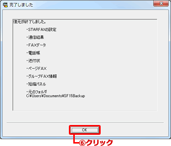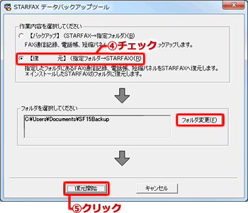 ※バックアップデータを「ドキュメント」、「マイドキュメント」以外、または、フォルダ名を変更して保存されている場合は、「フォルダ変更」ボタンをクリックして、バックアップを保存しているフォルダを指定してください。