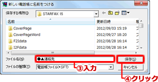 「ファイル名」に新しく作成する、電話帳の名前を入力し、 「保存」ボタンをクリックします。