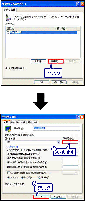 「電話とモデムのオプション」で、所在地情報の設定をしてください。