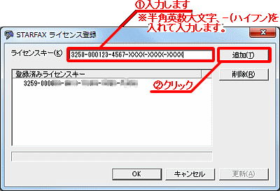 - 「ライセンス登録」画面の「ライセンスキー(K) 」に大文字の半角英数、−(ハイフン)を入れて入力し、「追加」ボタンをクリックします。