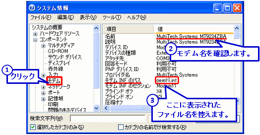 - 「システム情報」画面の左枠内の「コンポーネント」を展開し、「モデム」を選択します。