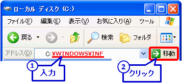 - 「ローカルディスク(C:)」をダブルクリックし、「アドレス」の「C:\」の後に「\WINDOWS\INF