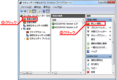 「セキュリティが強化された Windowsファイアウォール」画面の左枠内の「受信の規則」をクリックし、