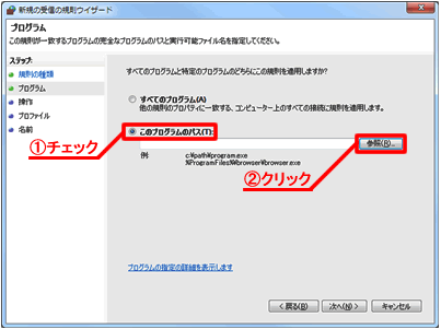 - 「このプログラムのパス」にチェックをいれ、「参照」ボタンをクリックします。