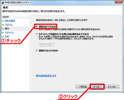 - 「接続を許可する」にチェックをいれ、「次へ」ボタンをクリックします。