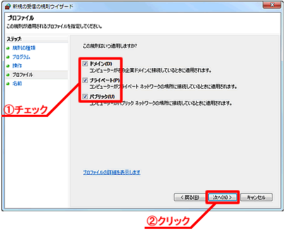 - 下図の3つにチェックをいれ、「次へ」ボタンをクリックします。