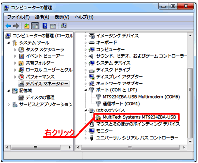 - 再度、「コンピュータの管理」画面の右枠内、「MultiTech Systems MT9234ZBA-USB」