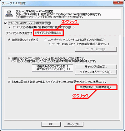 - 「グループFAX 設定」画面の「クライアントの接続方法」タブを開き、「高度な設定(上級者向き)」ボタンをクリックします。