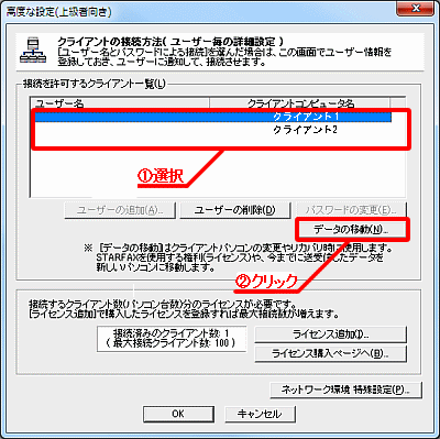 - 「接続を許可するクライアント一覧」から、クライアント名を選択し、「データの移動」ボタンをクリックします。