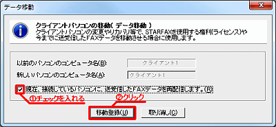 - 「現在、接続しているパソコン...」のチェックボックスにチェックをいれ、「移動登録」ボタンをクリックします。