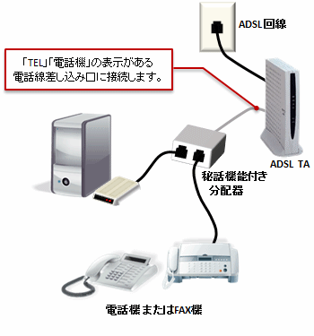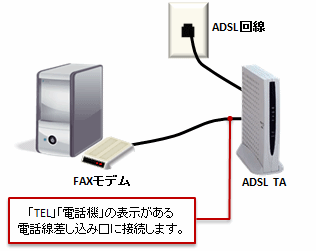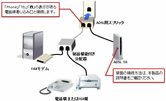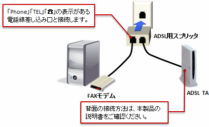 ADSL回線でご利用いただく場合の一般的な配線例は、以下をご参照ください。