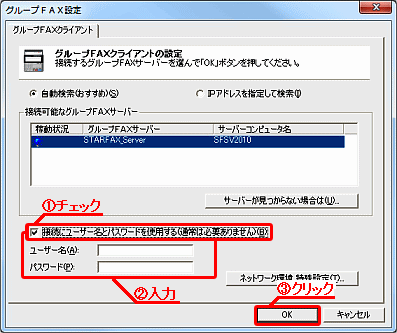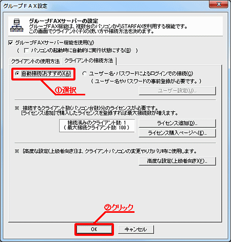 サーバー(親機)側で、グループFAX機能のクライアントの接続方法を、