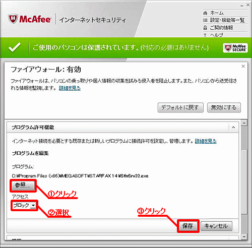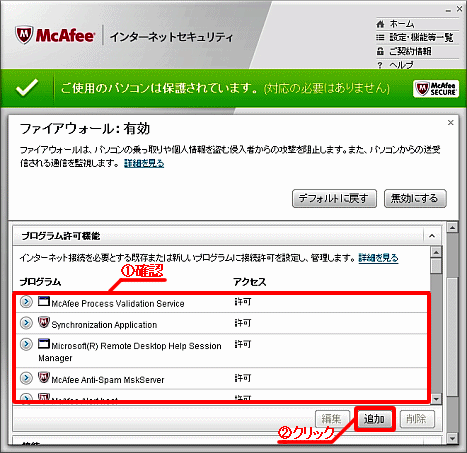 マカフィー インターネットセキュリティ2011、2012、マカフィートータルプロテクションの「ファイアウォール」の設定方法は、以下操作方法をご参照ください。