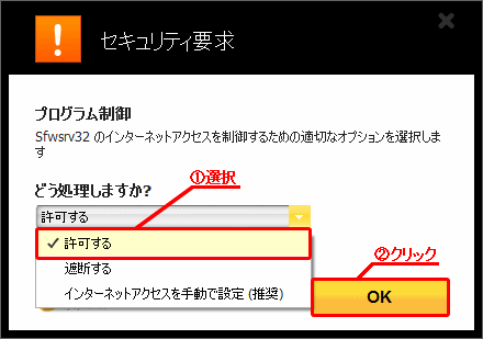 「どう処理しますか?」を「許可する」に変更し、「OK」ボタンをクリックします。
