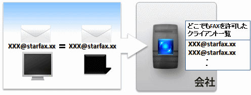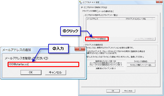 どこでもFAXをお使いいただくには、STARFAX Server 2010に、どこでもFAX機能を使用するクライアントのメールアドレスを登録してください。 また、同じメールアドレスで、別のパソコンのクライアントからどこでもFAXを使用する場合は、STARFAX Server 2010に同じメールアドレスを別途登録する必要があります。 ![]() 登録方法は、以下の操作方法をご参照ください。 ■操作方法