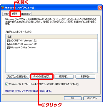 - 「例外」タブを開き、「プログラムの追加」ボタンをクリックします。