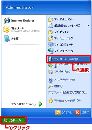 - Windows「スタート」ボタンをクリックし、「コントロールパネル」を選択します。