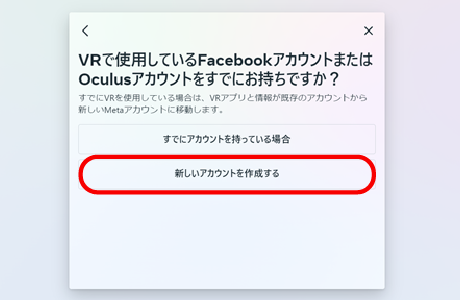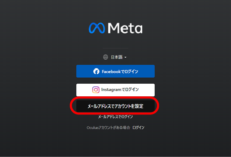 PCのOculusアプリを起動してログイン画面が表示されたら、「メールアドレスでアカウントを設定」をクリック。