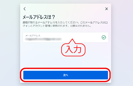 名前とユーザーネームを入力後、「次へ」をクリック。