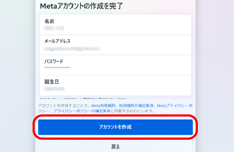 先程入力した内容が表示されています。「アカウントの作成」をクリック。