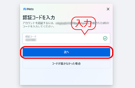「⑤」で入力したメールアドレスに送信された認証コードを入力。「次へ」をクリック。