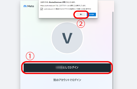 上部に”このサイトはOculusCilent.exeを開こうとしています”が表示されたら、「開く」をクリック。