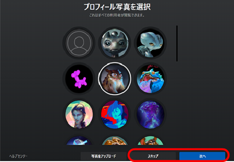 プロフィール写真の設定画面が表示されます。「⑨」で写真を設定した方は、同じ写真が設定されます。スキップされた方はここでもスキップボタンが表示されます。「スキップ」または「次へ」をクリック。