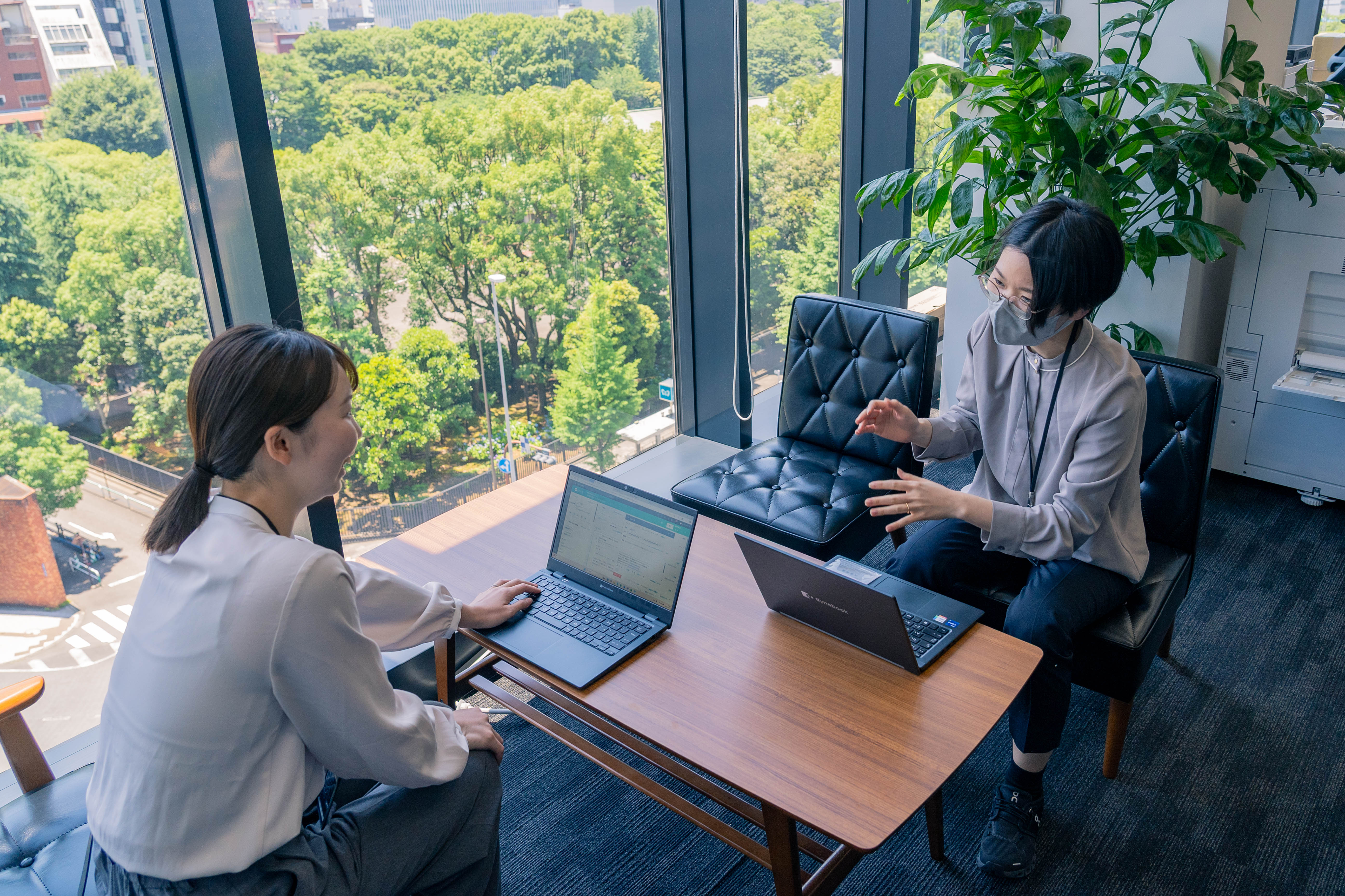 すっきりとした事務スペース。個人の荷物はロッカーや机の下に、パンフレットなどは倉庫にしまうことで、秩序が保たれる