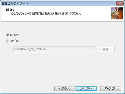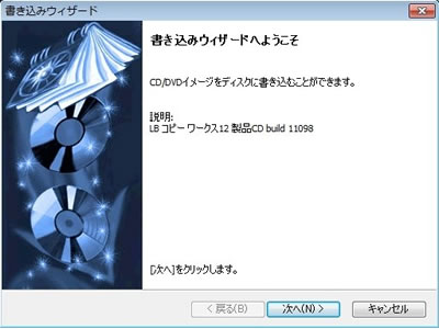 CD-R/RWの書き込みに使用するドライブが表示されない場合には、[戻る]ボタンをクリックして[ファイル]を選択し、LB コピー ワークス12の製品CDのISOイメージ ファイルを適切な場所に保存してください。ISOファイルの保存後は、任意のCD/DVDライティングソフトを使用して、CD-R/RWに書き込んでください。 |